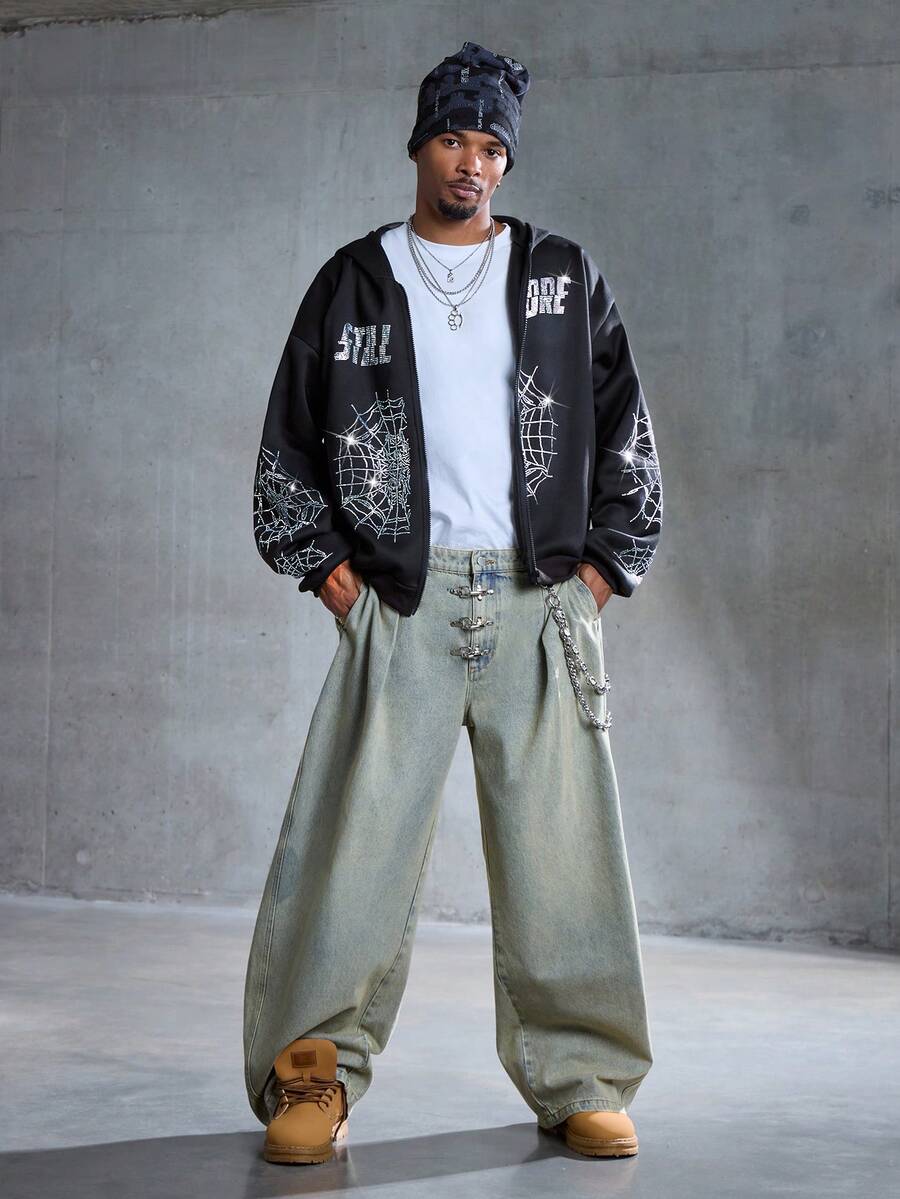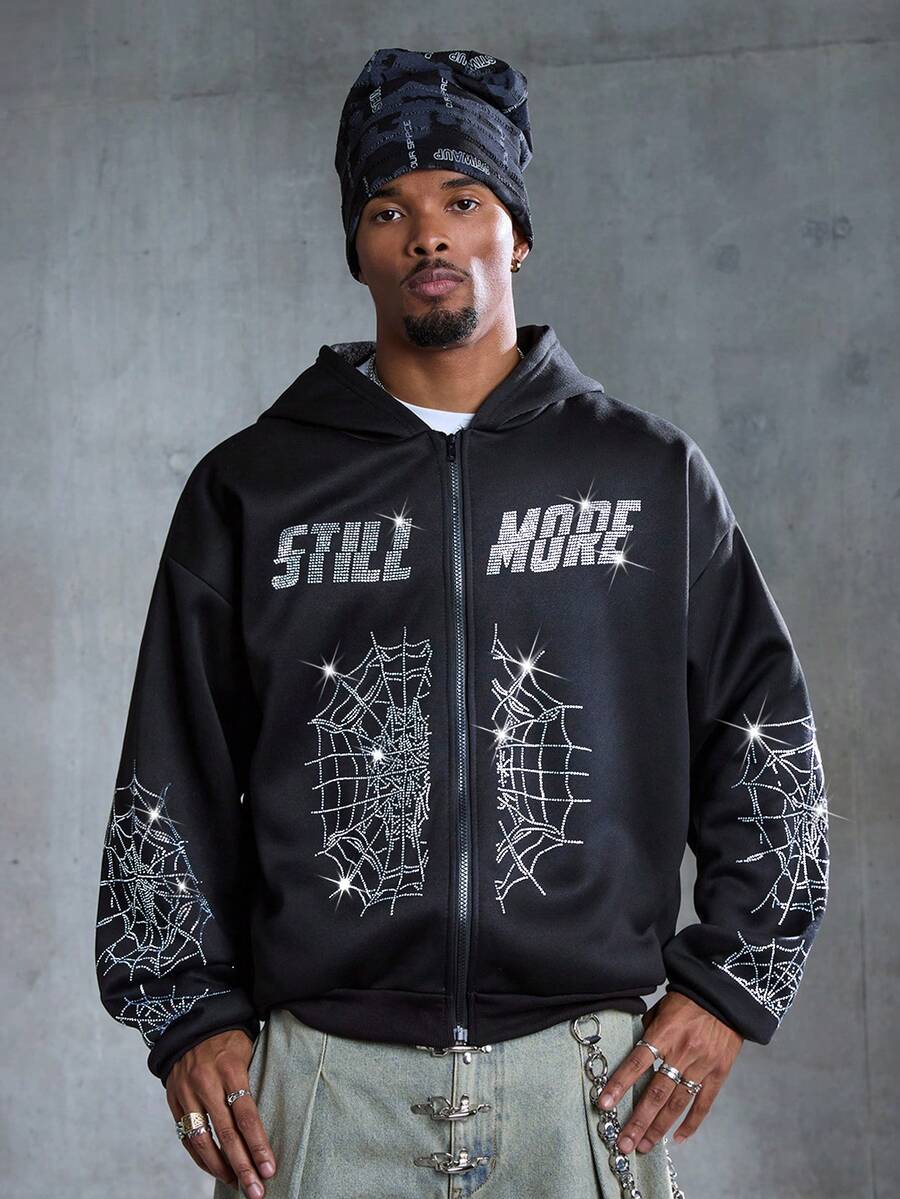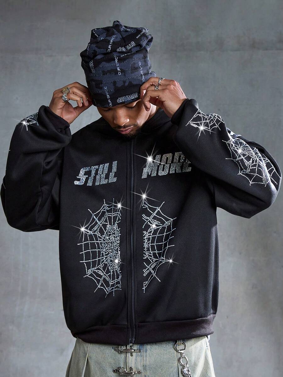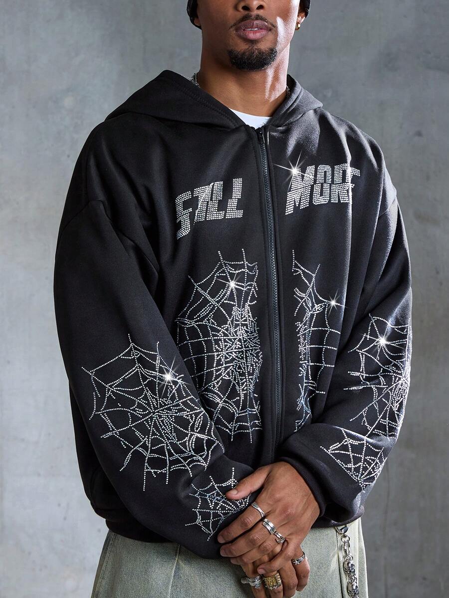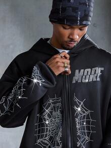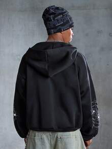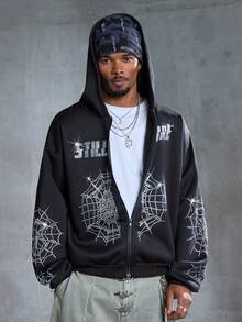 Street Life Felpa con cappuccio casual da uomo con chiusura lampo e motivo a ragnatela, spalle abbassate