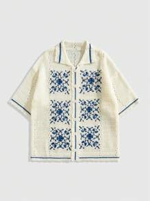 Casual Camicia larga a maglia con motivo ricamato per uomo, top a maniche corte in maglia