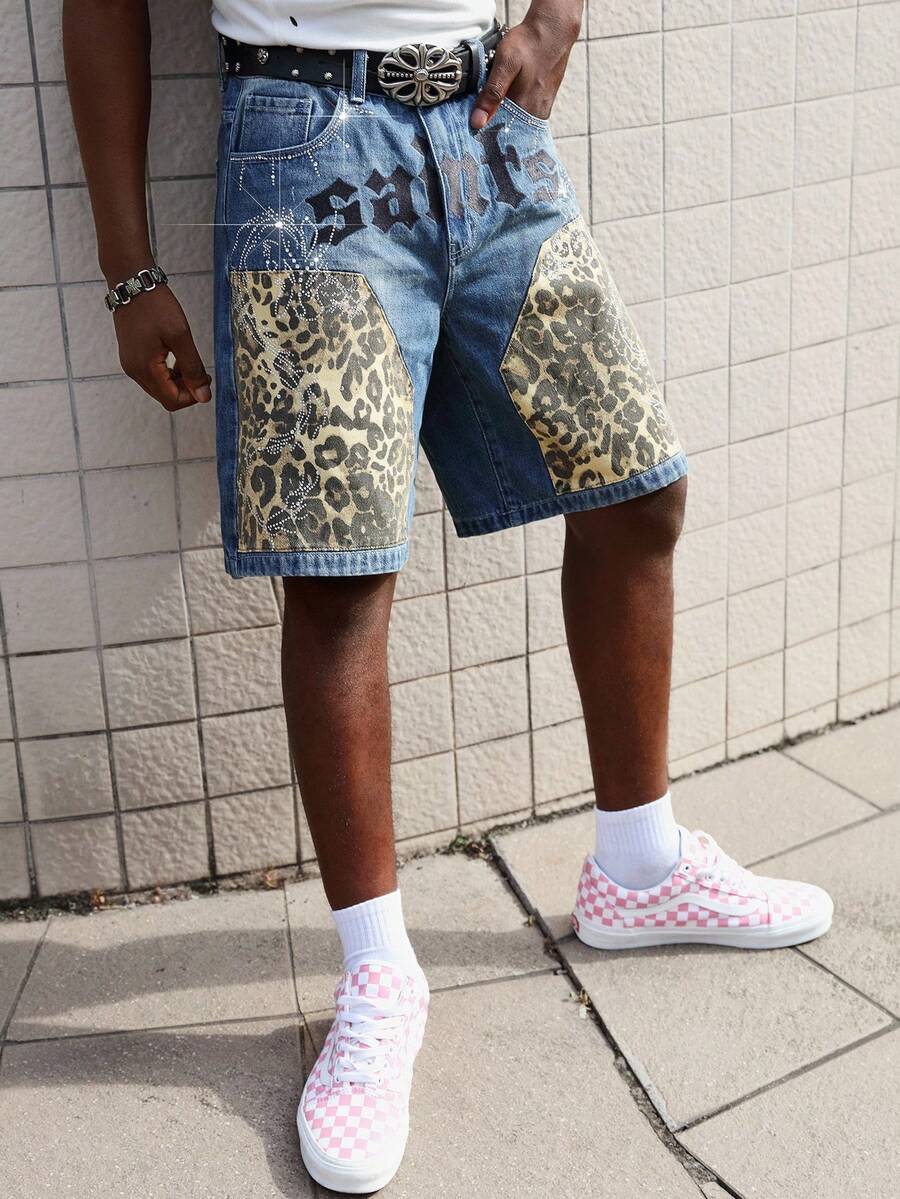 Street Life Bermuda di jeans da uomo alla moda con stampe leopardate e lettere, tasche