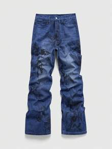 Street Life Jeans di moda in denim blu con vita alta e stampa retrò per uomo