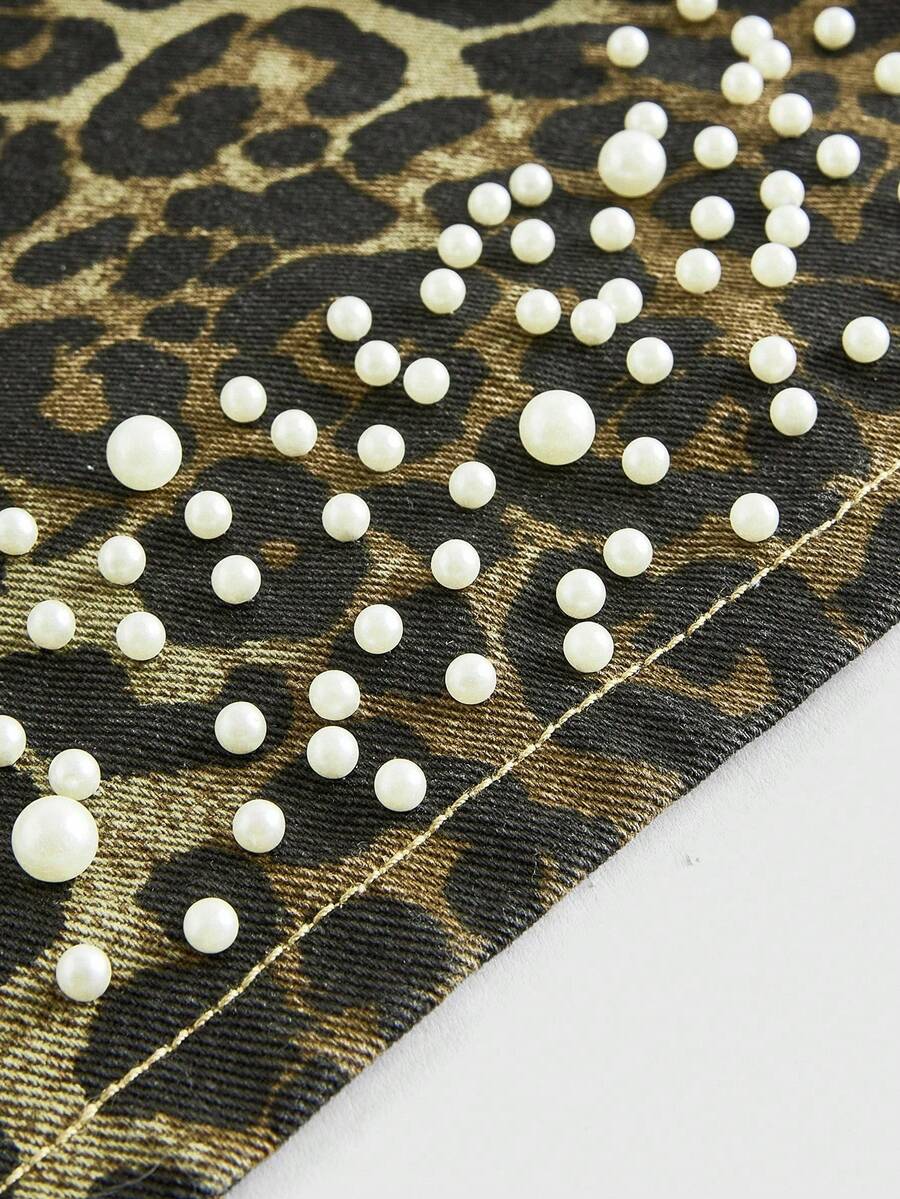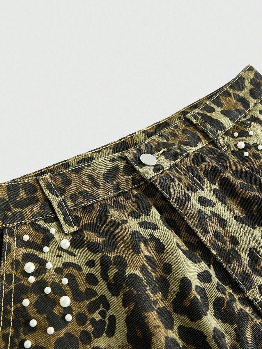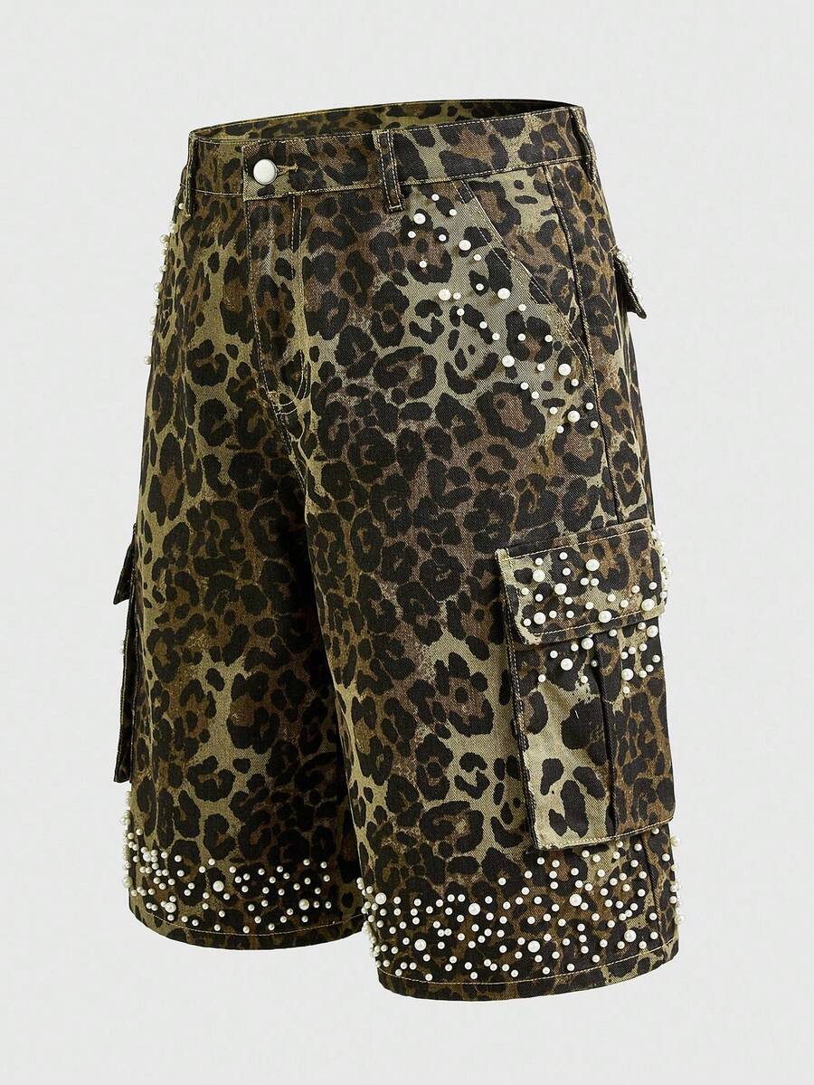 Street Life Pantaloncini cargo in denim da uomo con stampa leopardata e decorazione con perline