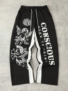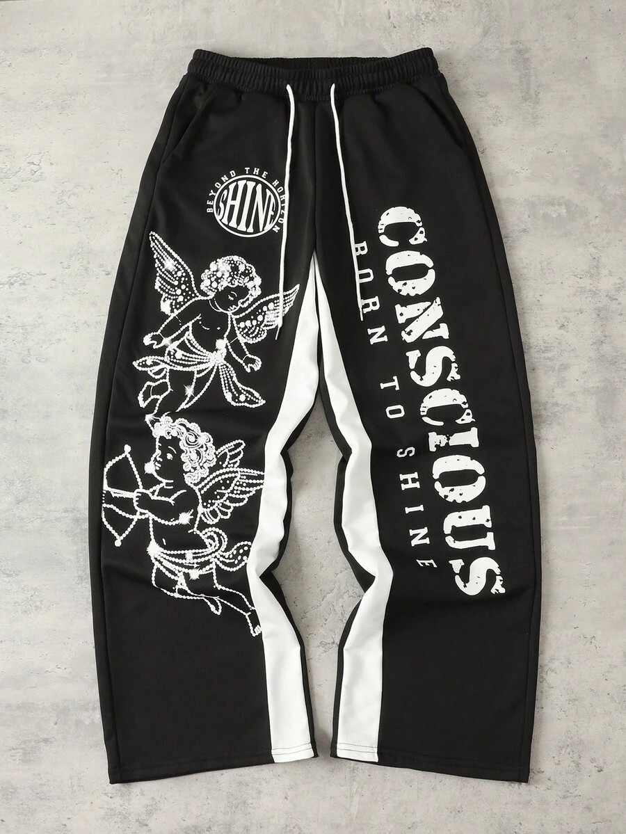 Street Life Pantaloni casual da uomo con stampa di angeli, vita con coulisse e gamba ampia