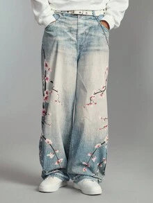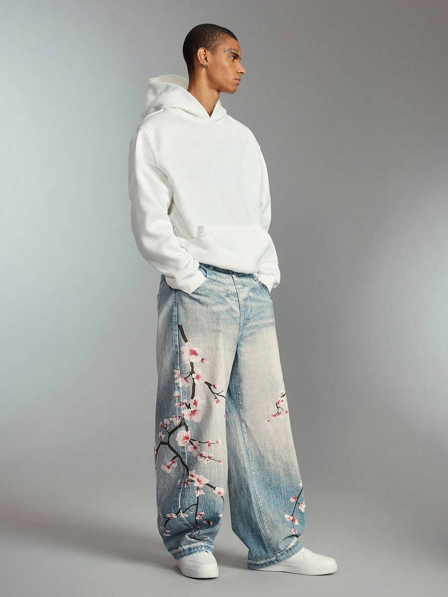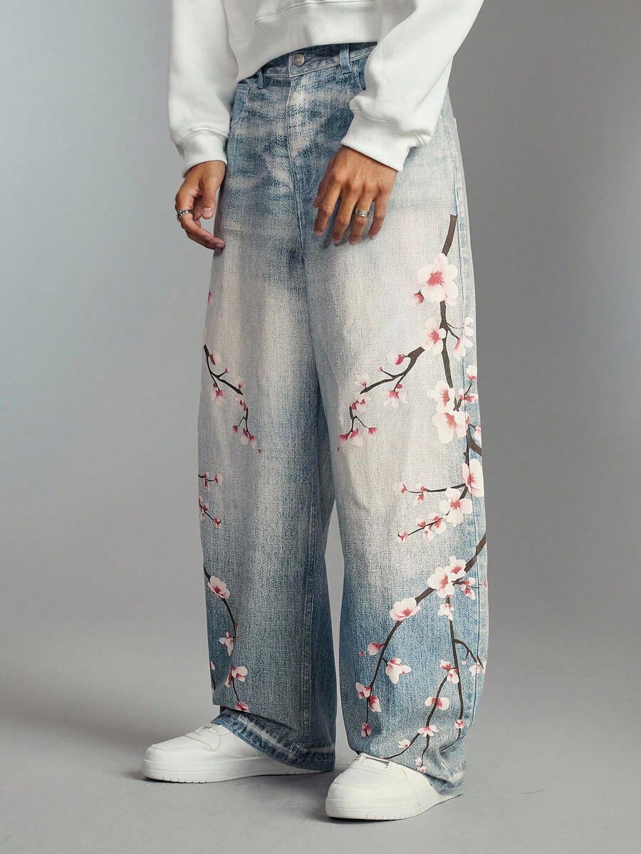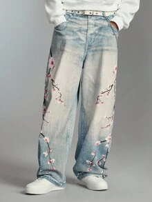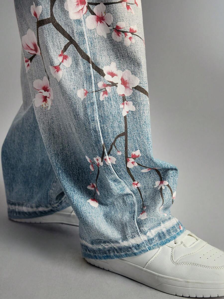 Street Life Jeans larghi da uomo in stile casual di strada con motivo a fiori di prugna, vestibilità ampia