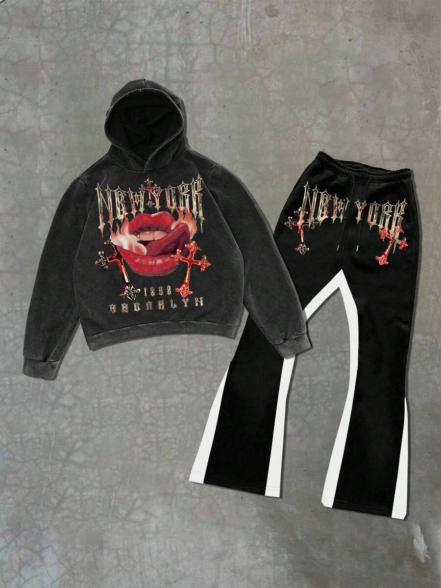 Street Life Set da uomo composto da felpa con cappuccio nera con stampa a lettere a croce sulla bocca e pantaloni della tuta in colore a contrasto