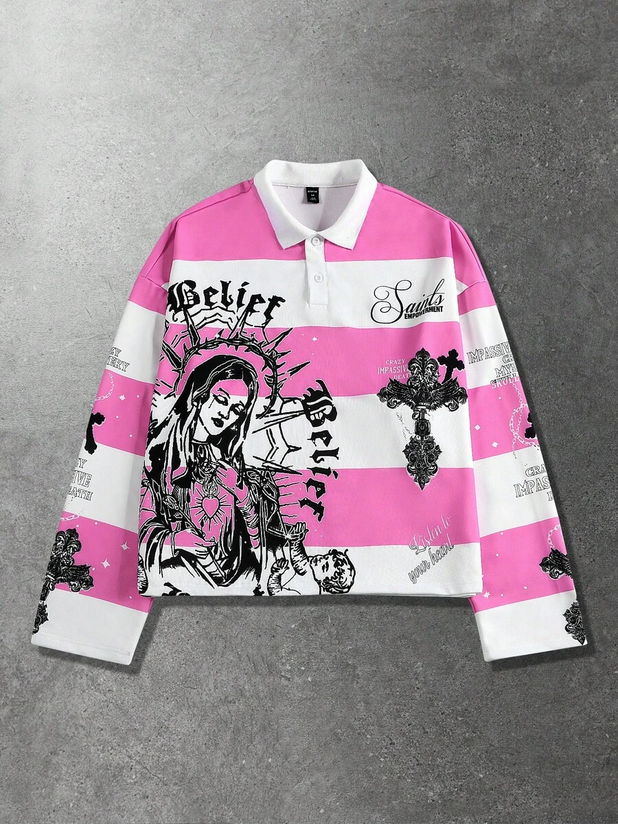 Street Life Felpa uomo retrò con grafica della Vergine Maria a righe in stile inglese, felpa stile polo in stile americano da strada