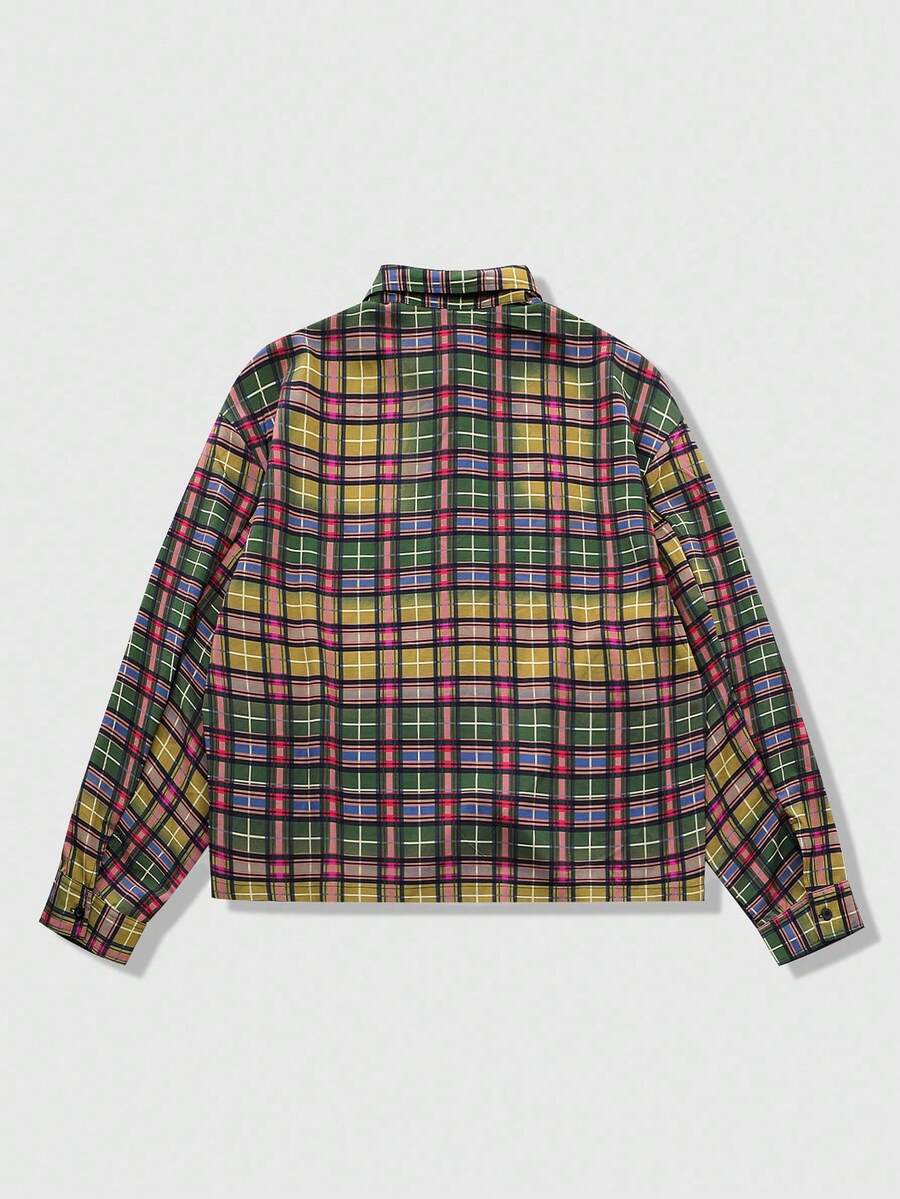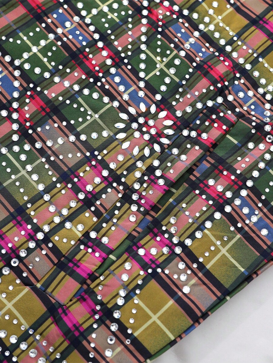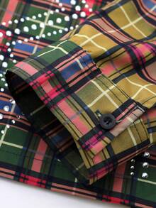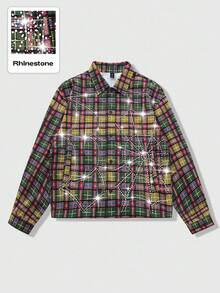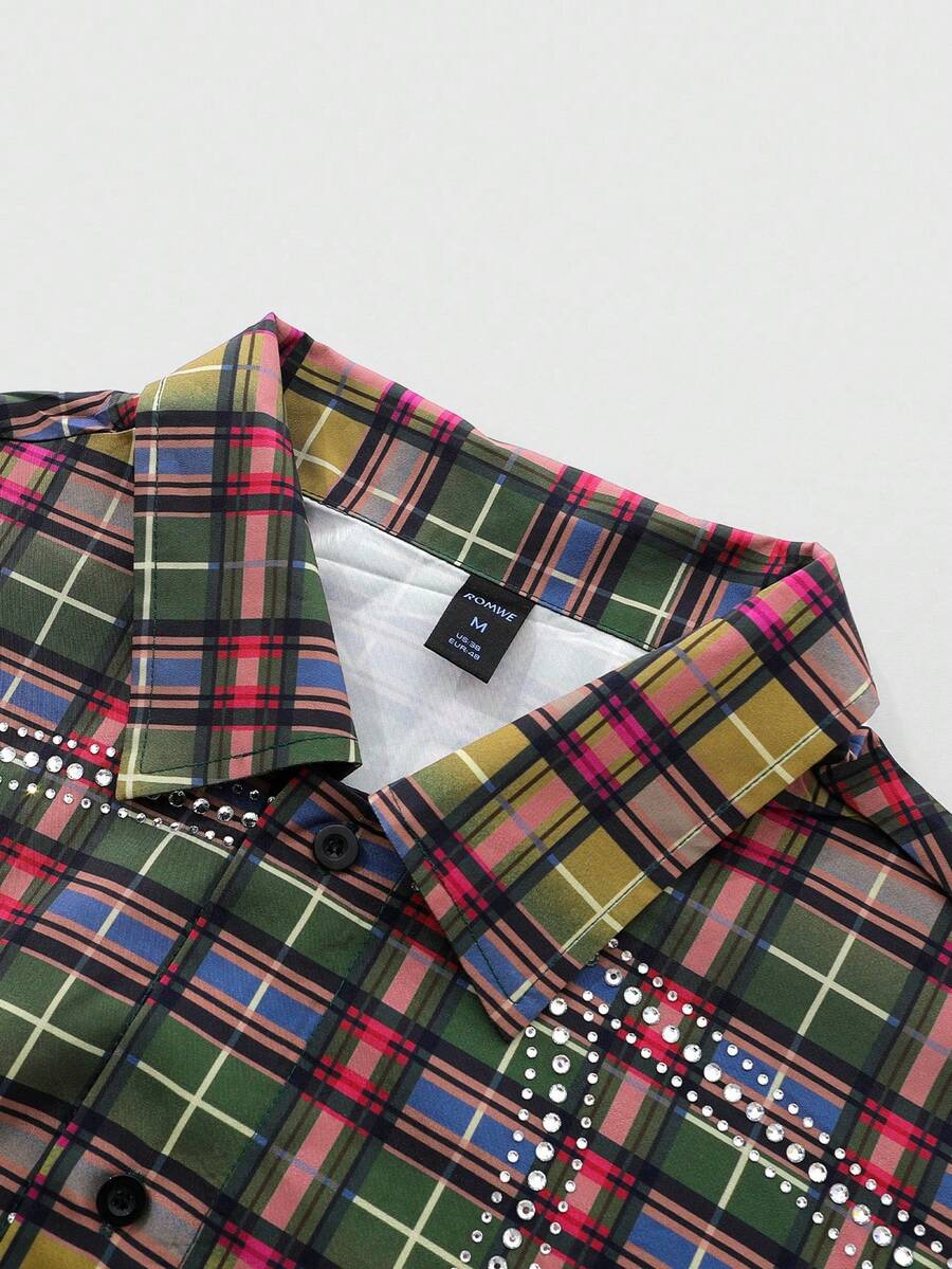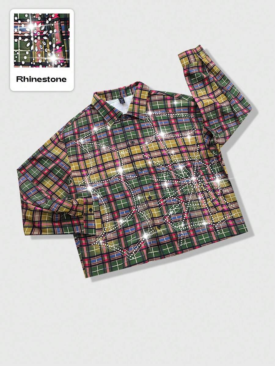 Street Life Camicia da uomo con motivo a quadri con strass, manica lunga, stile americano casual
