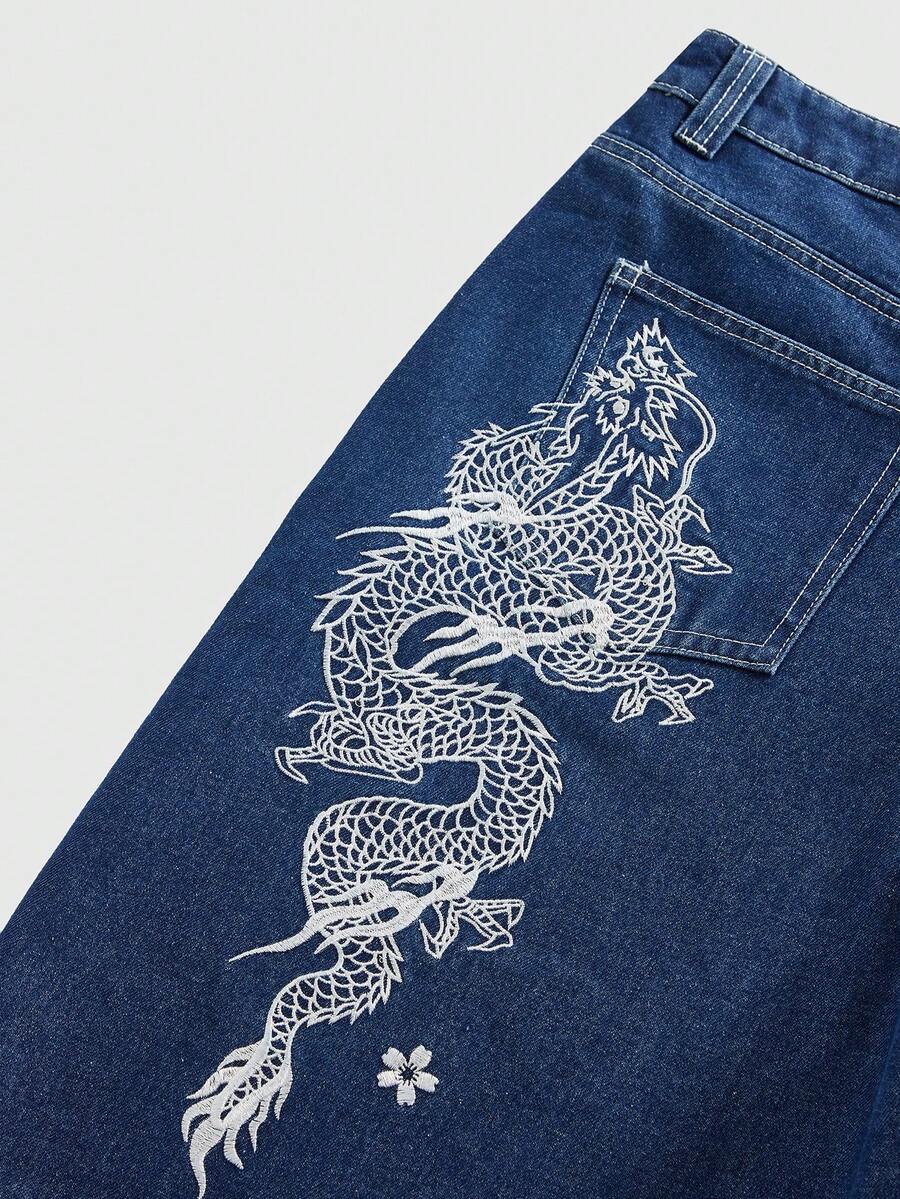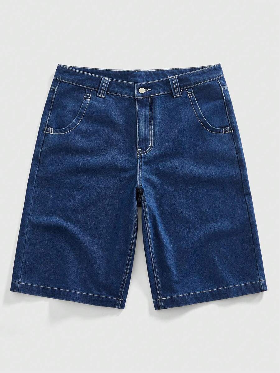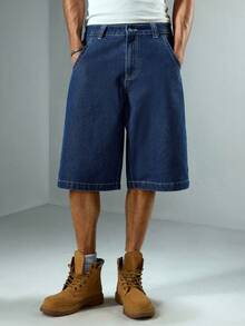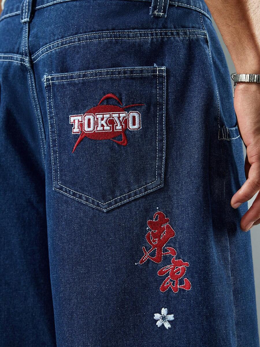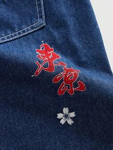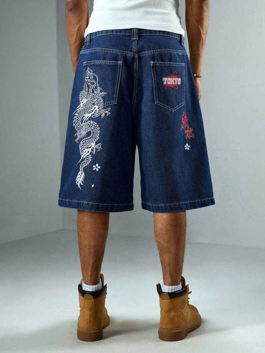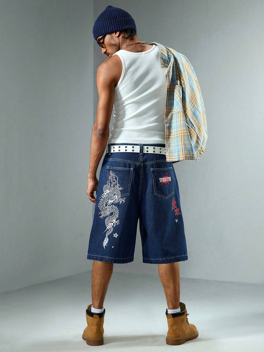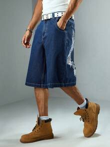 Street Life Pantaloncini di jeans casual larghi da uomo con ricamo a testo sulla tasca