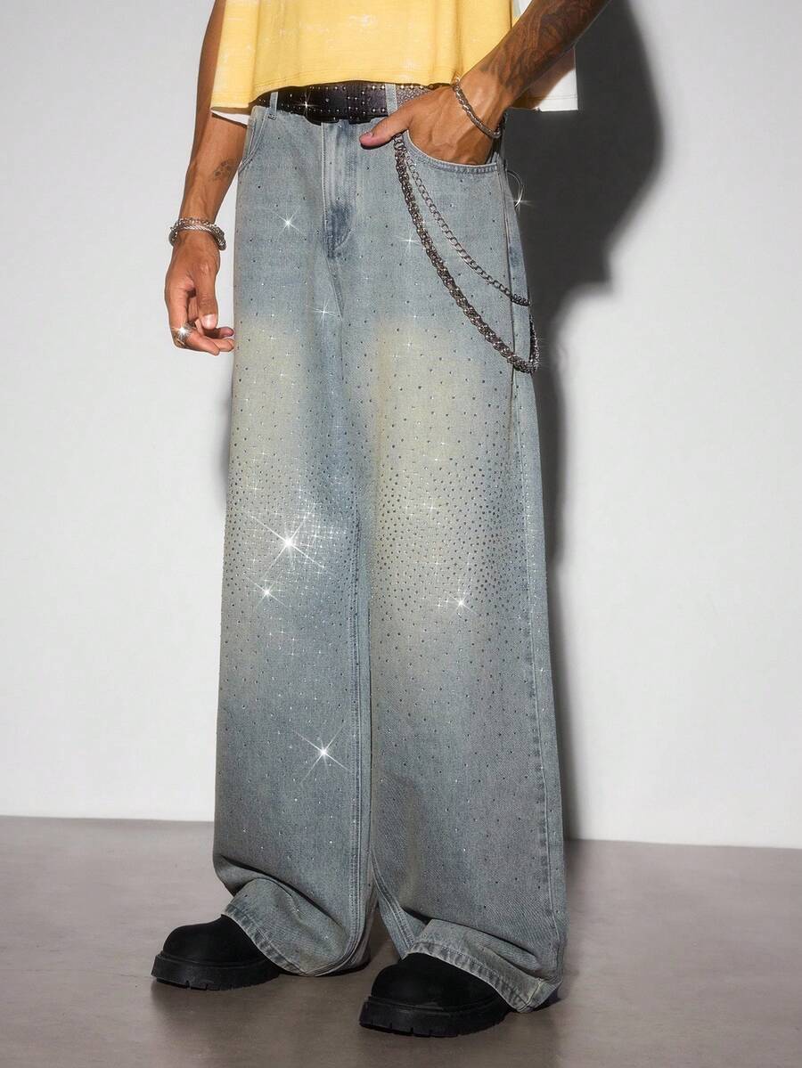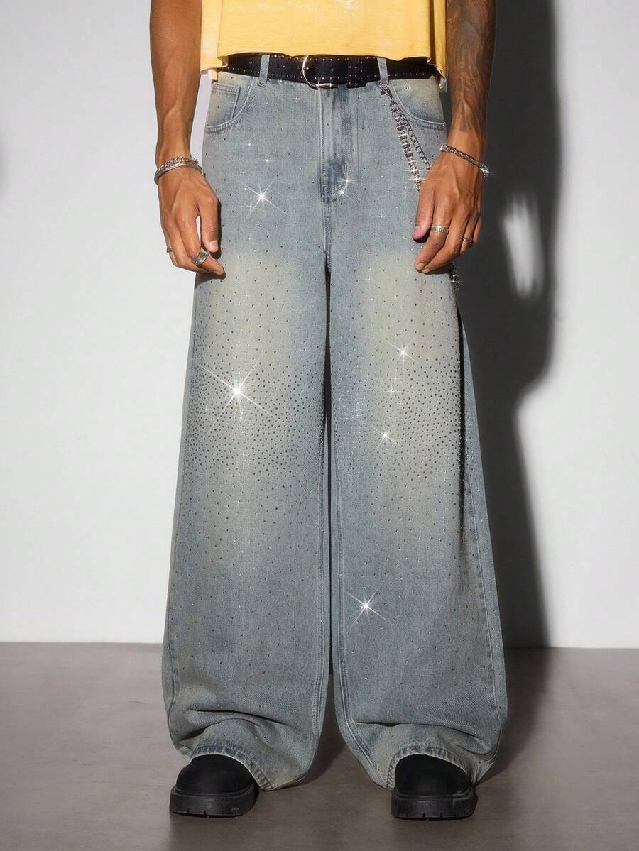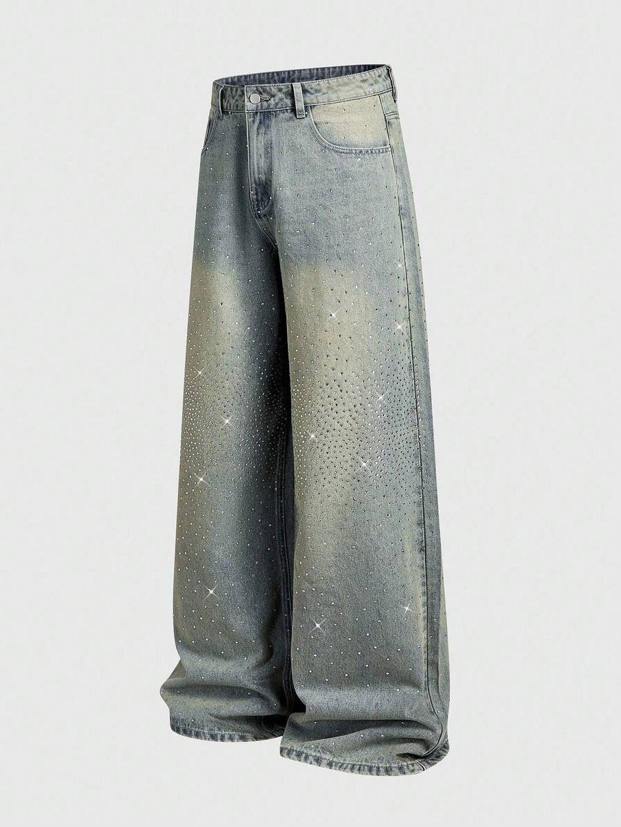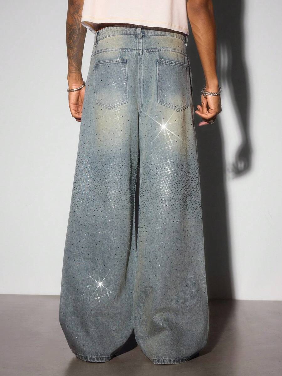 Street Life Jeans casual blu vintage con vestibilità morbida e strass luccicanti per uomo