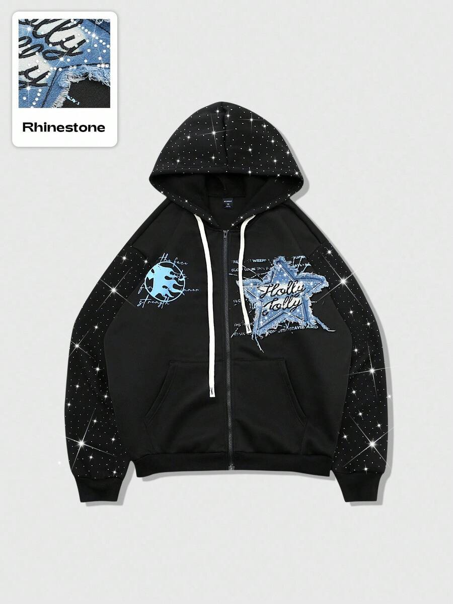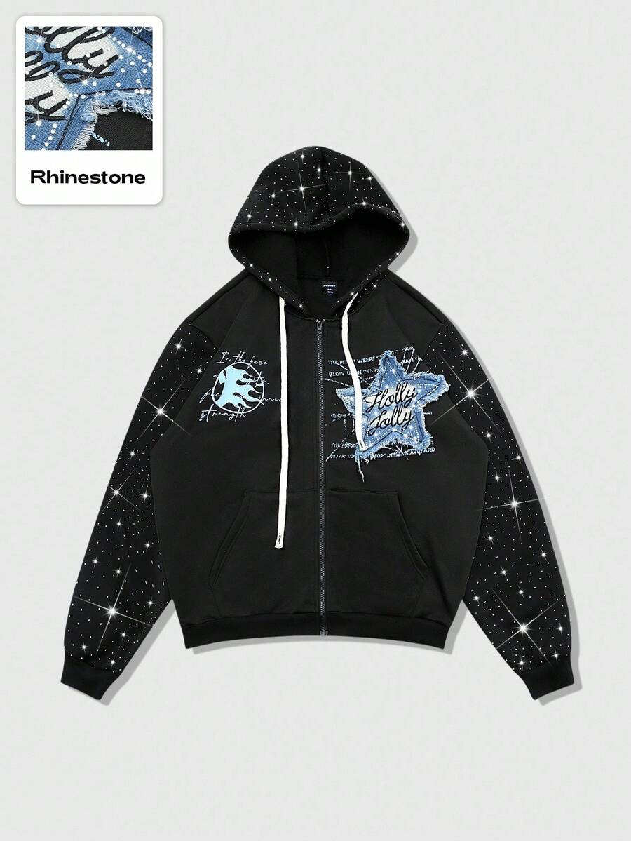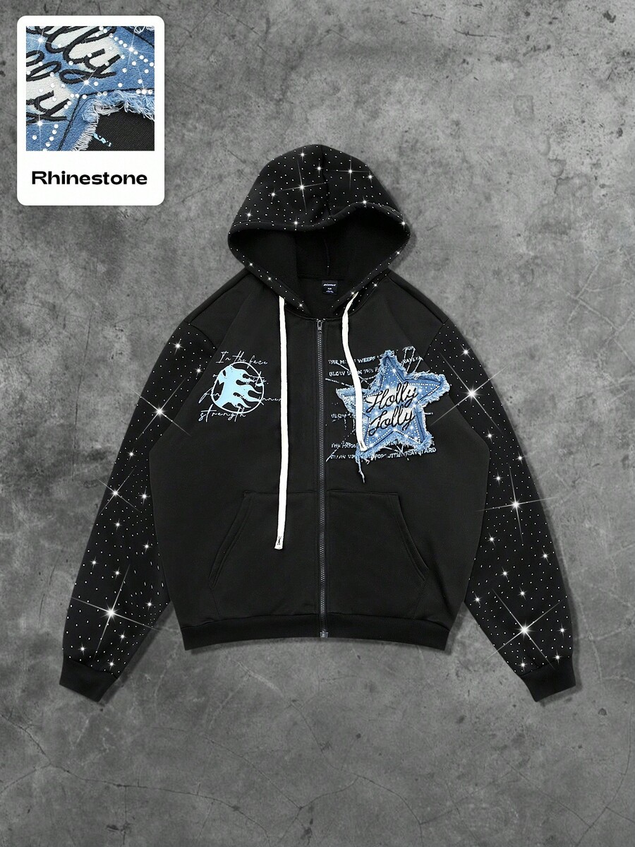 Street Life Felpa con cappuccio da uomo con chiusura lampo, stile di strada, ricamo di strass americano, stampa grafica in inglese, felpa con cappuccio per autunno/inverno