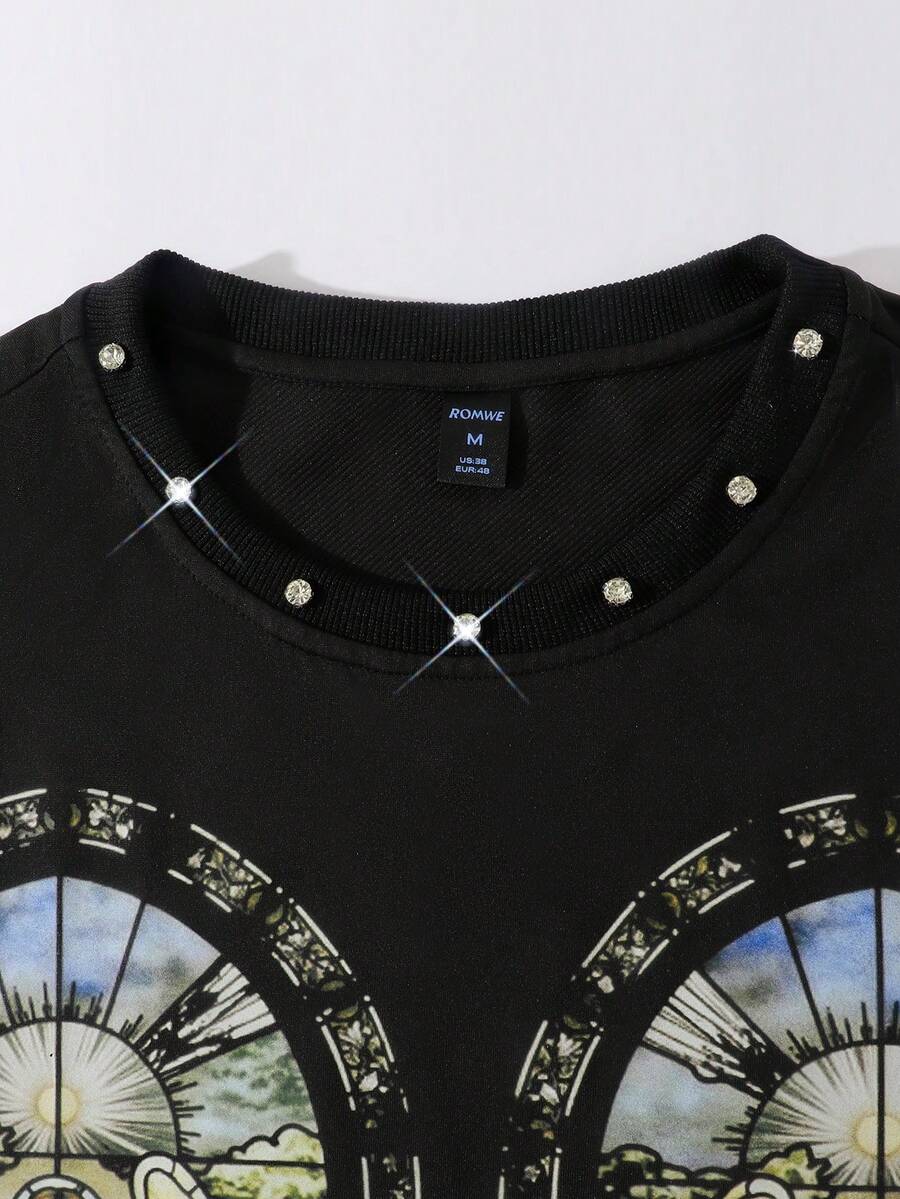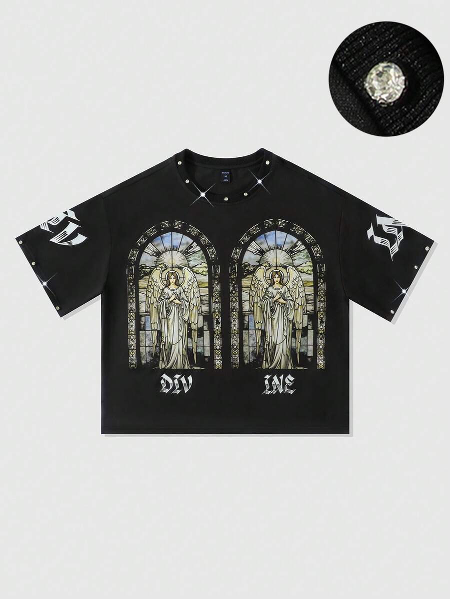 Street Life Maglietta ampia corta da uomo con stampa di strass religiosi, stile anni 2000