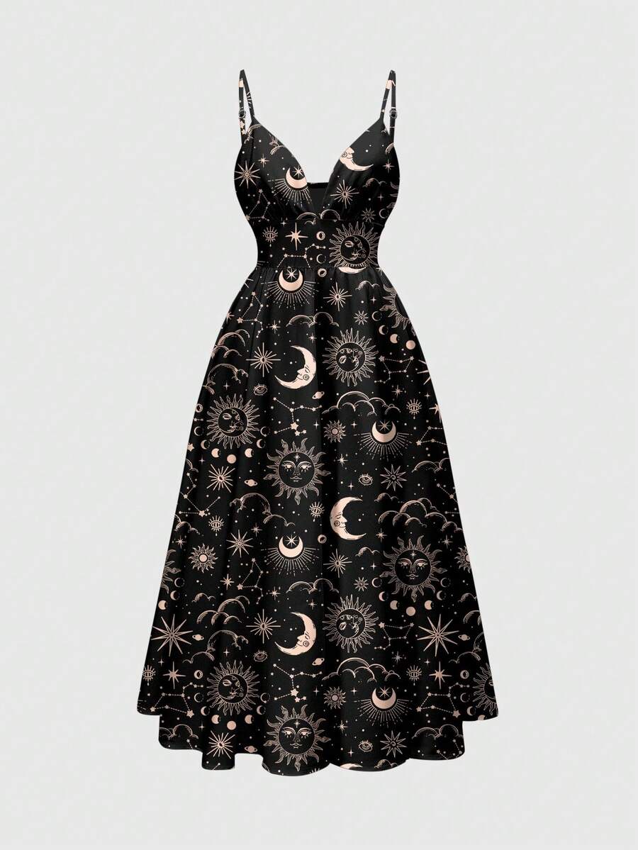 Abito da donna con stampa hippie di sole, luna e stelle, stile romantico bohémien, con spalline sottili e scollo basso, sexy