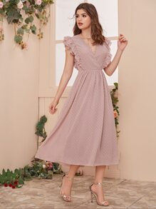Abito incrociato in maglia a pois con volant e pizzo