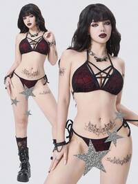 Goth Set costume da bagno gotico vampiresco 2026 SS, 2 pezzi, elegante e romantico, in tessuto rete con ragnatela gotica precisa, design con cinturini a pentagramma, decorazione fiocco, bikini triangolare nero e rosso, nuova collezione primavera/estate 2026 donna, adatto per Capodanno, San Valentino, ritorno a scuola, viaggi, spiaggia, pomeriggio del tè, feste, uso quotidiano, casual, sport all'aperto, outfit alla moda Goth Costume da spiaggia gotico scuro da vampiro, coprispalle da donna, kimono da donna e gonna asimmetrica con spacco alto a 2 pezzi, maniche a pipistrello oversize, gonna con spacco alto asimmetrico, tessuto in rete floccata a forma di pipistrello, decorazione con fiocco, colore nero, elegante, misterioso e sexy, adatto per spiaggia, vacanza in isola, festa, uso quotidiano