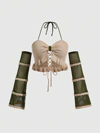 Fairycore Maglietta oversize vintage romantica con spalle scoperte, in pizzo e maglia, adatta per autunno/inverno