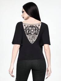 Goth Maglietta aderente da donna a maniche a campana, con scollo a barca, ricamo religioso a motivo cavo e colore unito
