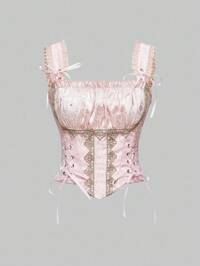 ROMWE Avant Maglietta da donna in stile retrò Cottagecore, 2 in 1, con inserti in pizzo e fiocco, scollo a U