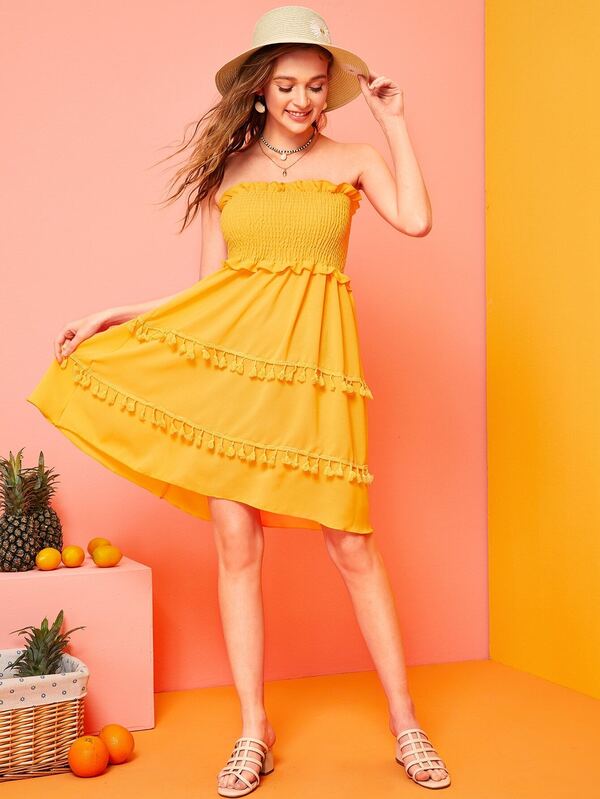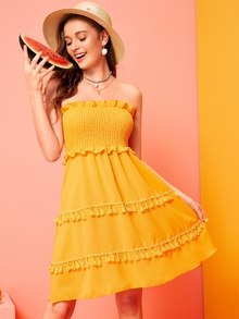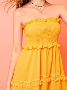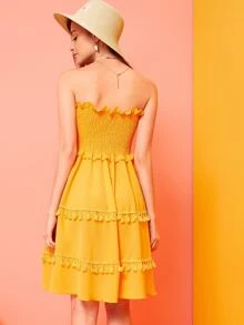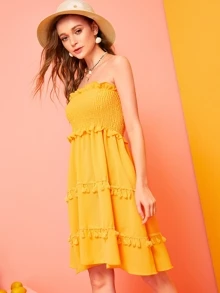 Abito bandana monocolore con volant e nappa