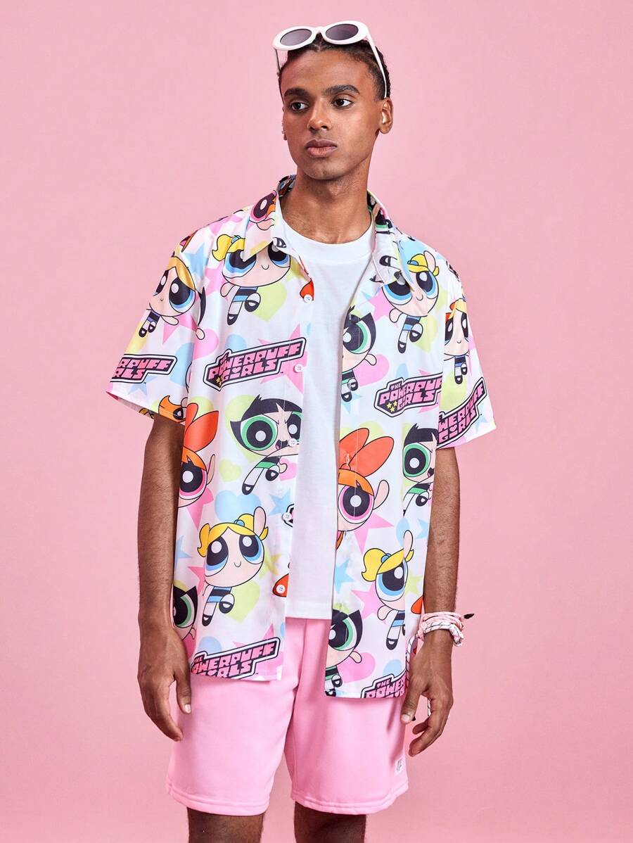 The Powerpuff Girls | ROMWE Camicia a maniche corte casual da uomo con stampa di cartoni animati e lettere, estiva, adatta per la scuola