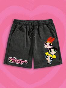 The Powerpuff Girls | ROMWE Pantaloncini larghi casual da uomo con coulisse in vita, con stampa di cartoni animati e lettere, per l'estate, la scuola