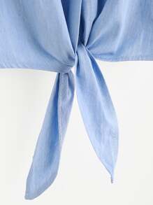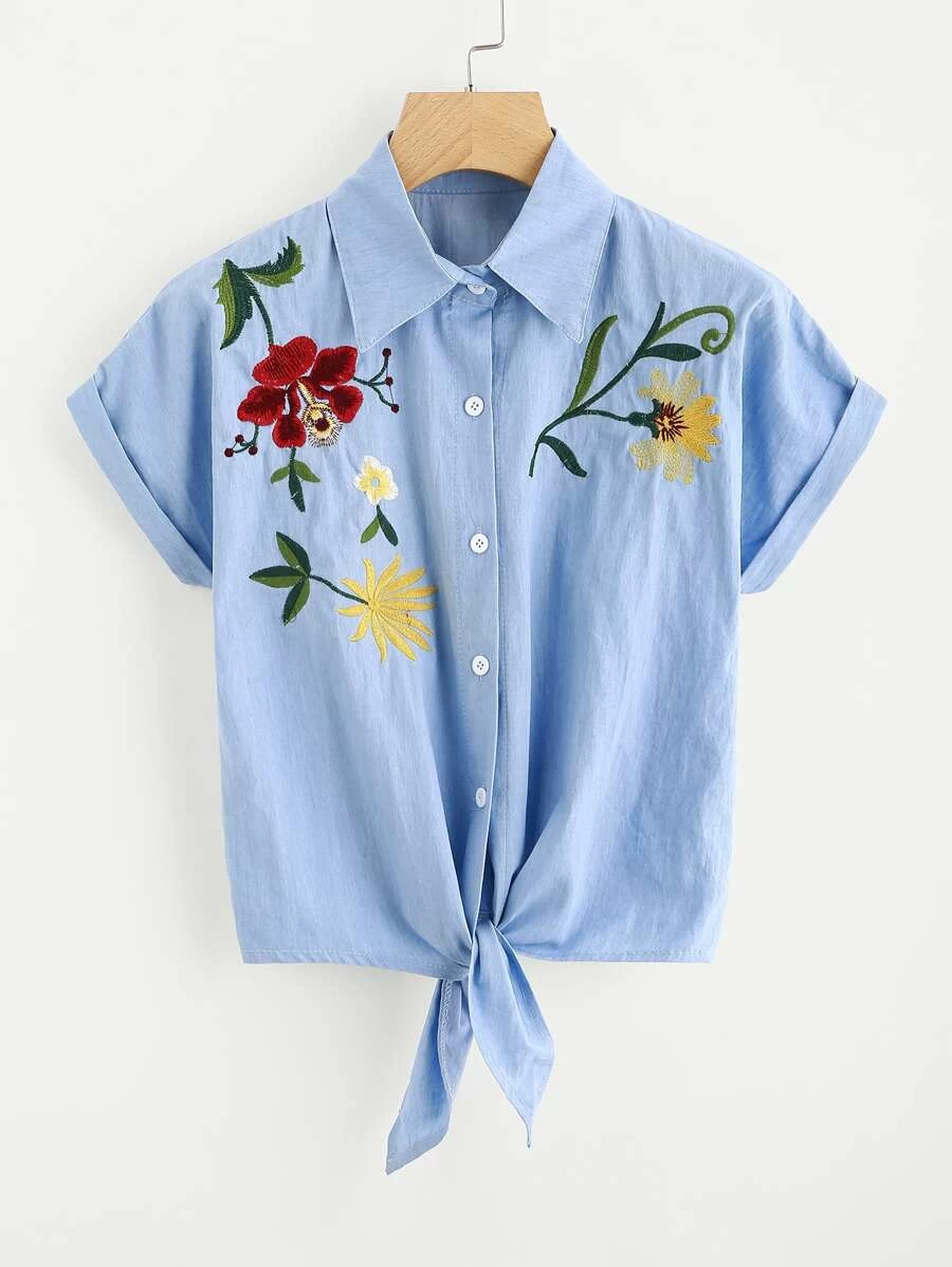Tie Front Flower Embroidered Denim Shirt