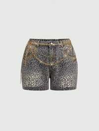 Grunge Punk Shorts di jeans mini con decorazione a catena di metallo e strass con stampa leopardata in stile punk Y2K, shorts di jeans leopardati punk di taglia grande