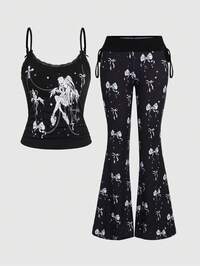 Set da 2 pezzi: Canotta con stampa di ragazza anime carina e pantaloni a vita bassa a zampa