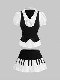 ROMWE Avant Set da 2 pezzi da donna in stile collegiate con stampa a tastiera di pianoforte a quadri e colore a contrasto, adatto per il ritorno a scuola
