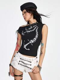 Grunge Punk Maglietta aderente a spalle scoperte con stampa a catena di ancora e decorazioni in strass