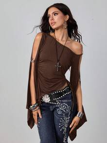 Hippie Maglietta casual da donna con spalla asimmetrica, vita stretta e maniche a pipistrello a campana, stile vintage