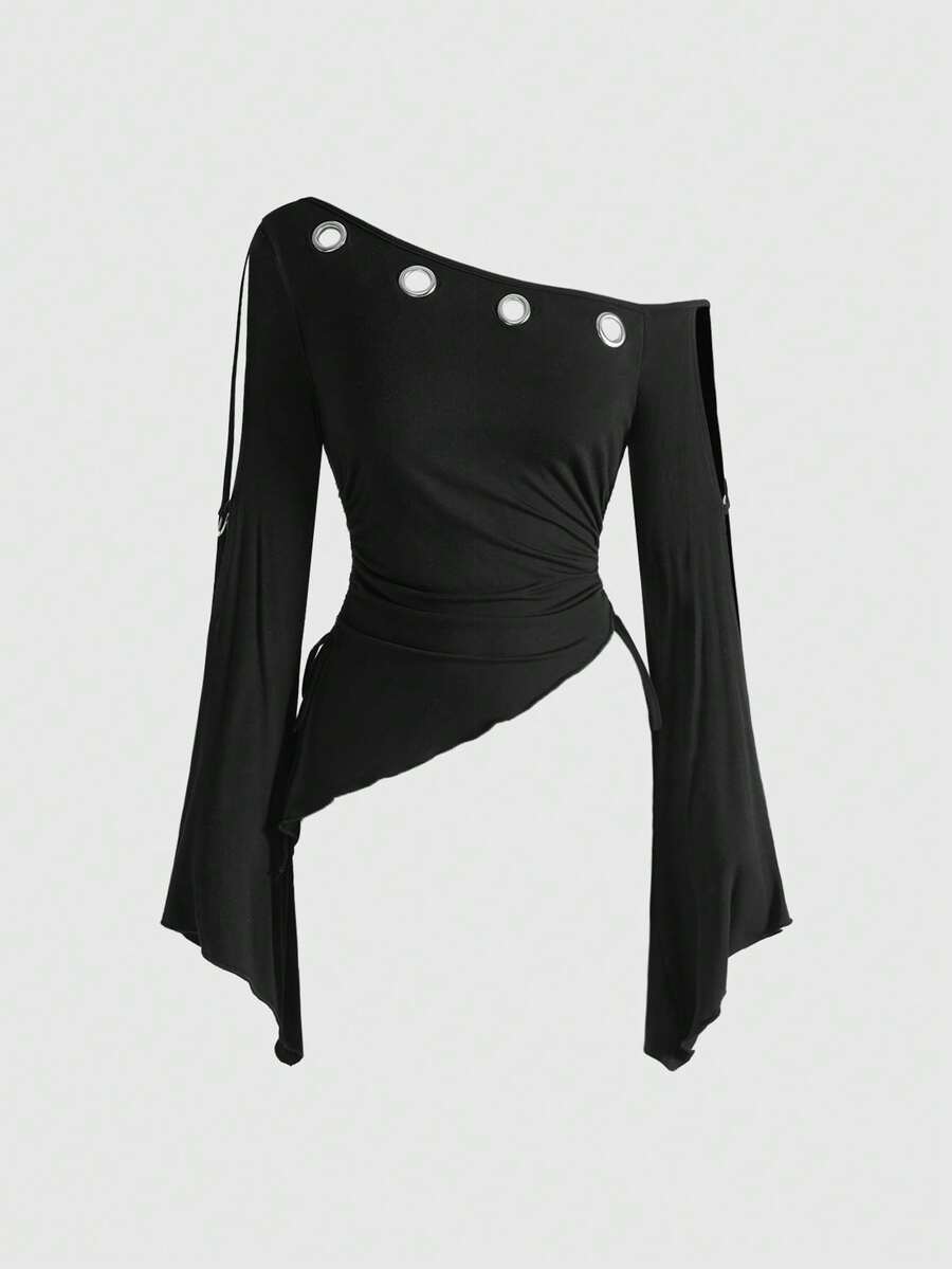 ROMWE Avant Maglietta casual da donna con maniche a pipistrello, spalla asimmetrica, vita stretta e balze, con occhielli in stile vintage