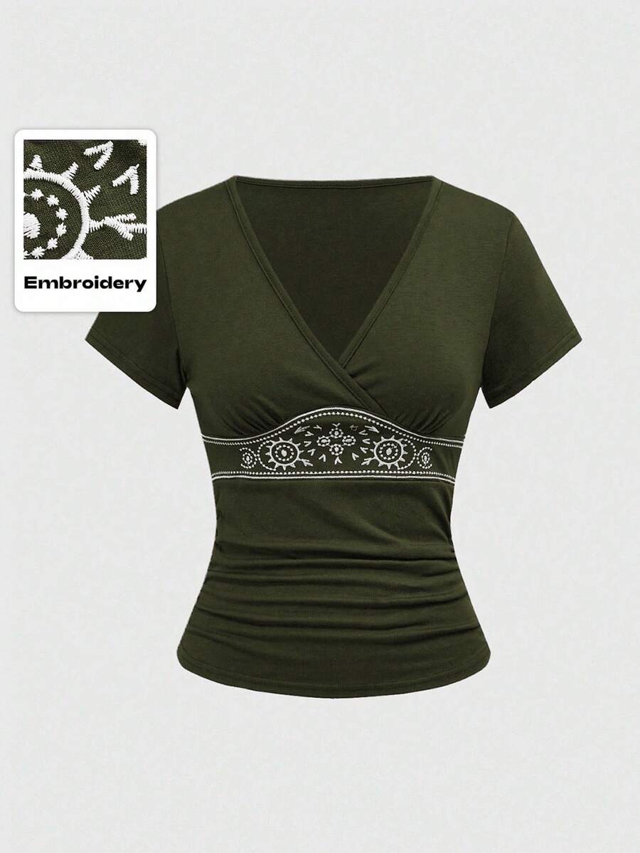Hippie Maglietta a maniche corte con vita elastica e ricamo floreale vintage, colore marrone, adatta per l'estate, spiaggia, feste, festival musicali, stile boho