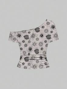 Grunge Punk Maglietta casual da donna con stampa vintage grunge di luna e viso, spalle oblique, sexy