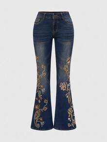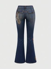 Hippie Jeans a zampa da donna con vita super bassa, slim fit, con ricamo paisley vintage, strass e effetto vissuto