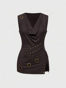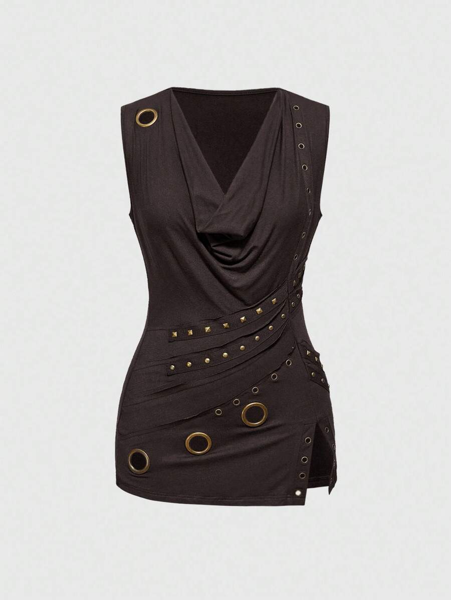 Grunge Punk Top aderente da donna con scollo a cascata, design con borchie in stile vintage punk e spacchi laterali