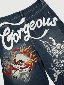 Grunge Punk Jeans larghi a vita bassa con stampa vintage di teschi e viti, ricamati, stile streetwear per donne