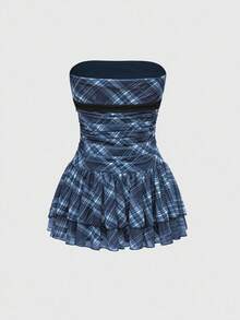 J-Fashion Abito mini vintage dolce con stampa a quadri, volant sul fondo e senza spalline per le donne