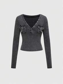 Maglietta a maniche lunghe girocollo in maglia lavata e invecchiata con tasche sul petto, colori carbone e nero, adatta per laurea, Pasqua, concerti, vacanza a Nashville
