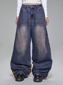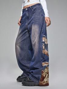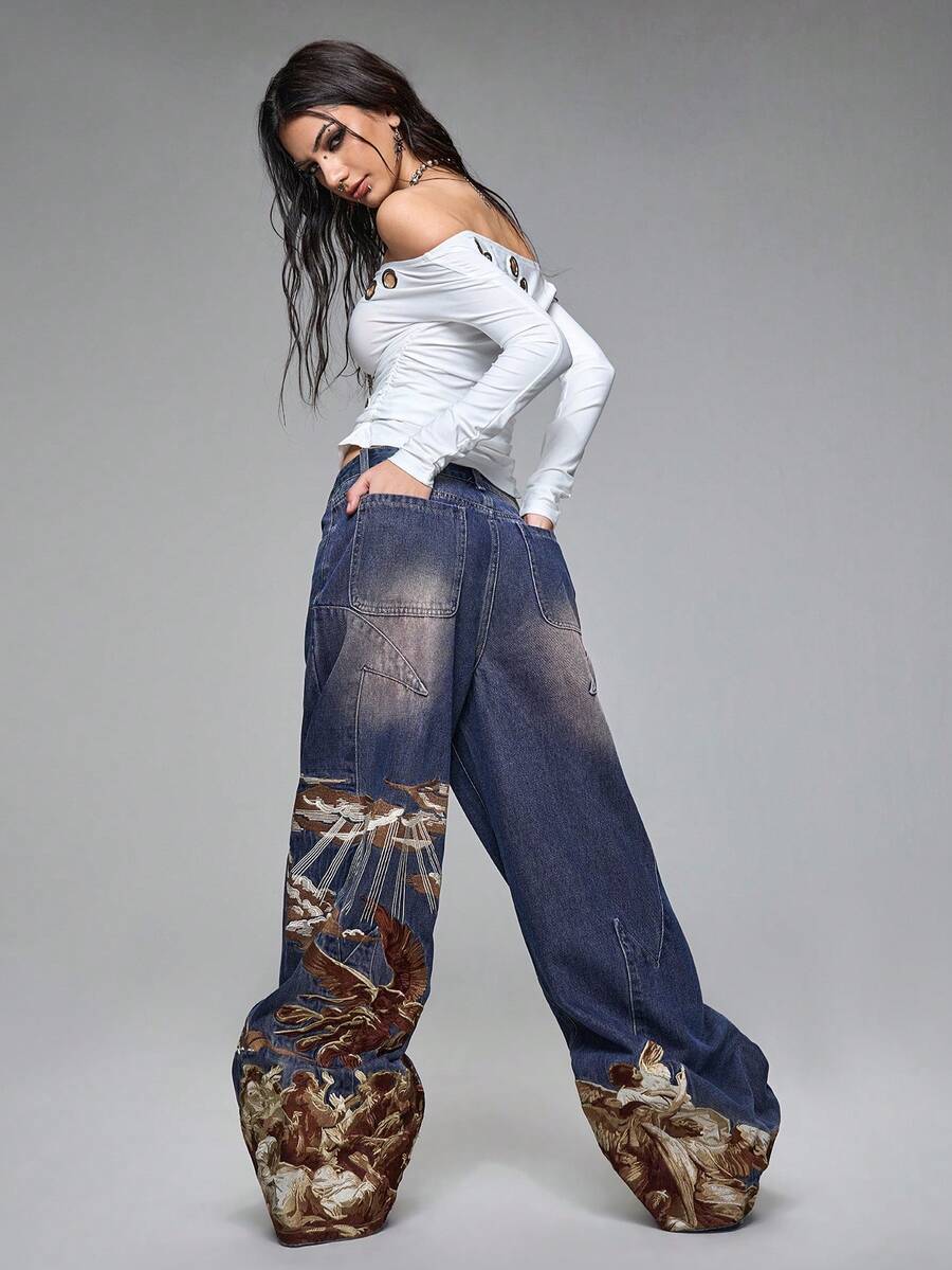 Grunge Punk Jeans vintage lavati a effetto vissuto, vita bassa, gamba ampia, con ricamo di angeli in stile rinascimentale