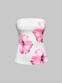 Kawaii Top senza spalline plissettato con stampa floreale estiva, per la scuola