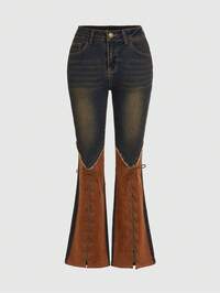 Jeans a zampa di donna vintage stile hippie western in camoscio con patchwork e effetto consumato