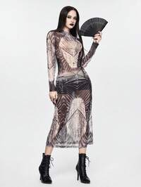 Goth Abito lungo a maniche lunghe in rete con stampa del totem di Shanhaijing, stile gotico e misterioso