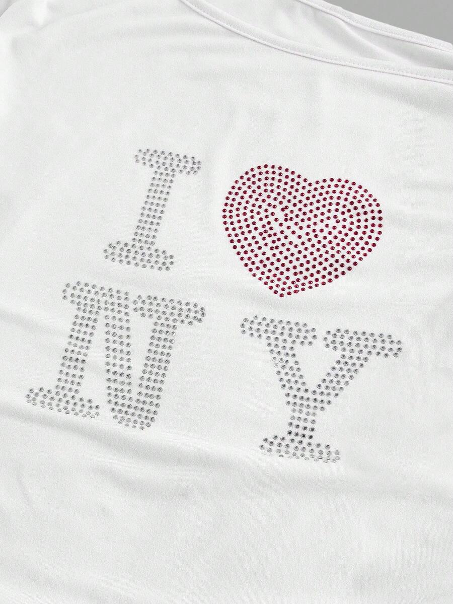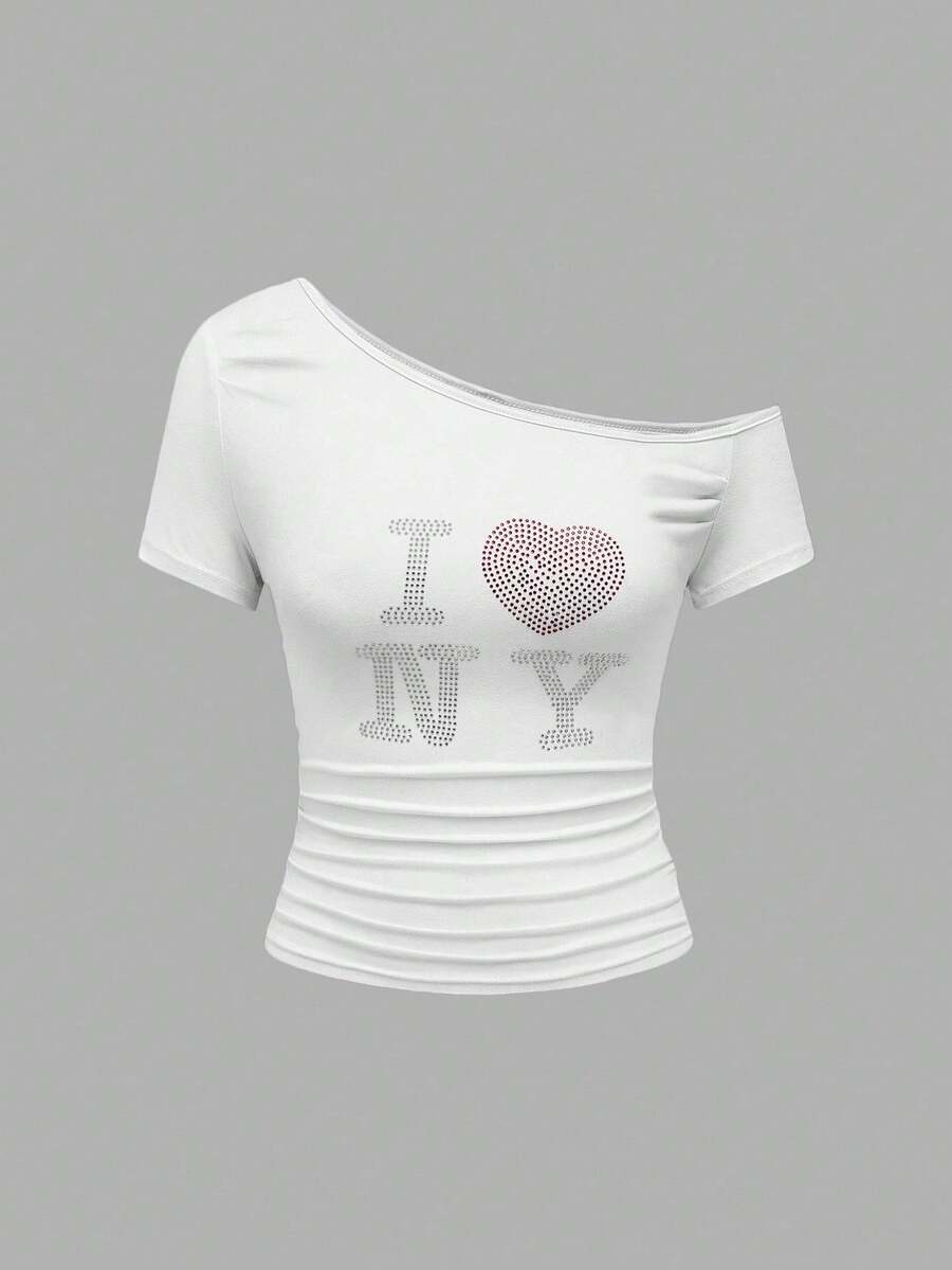 maglietta casual da donna con scollo asimmetrico, stampa con cuore e lettera in strass, adatta per l'estate