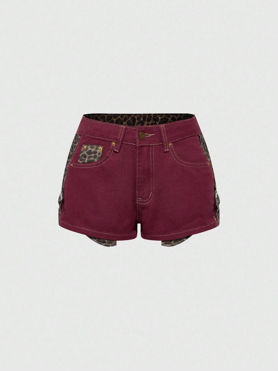 Grunge Punk Pantaloncini casual da donna in denim con stampa leopardata e patchwork, vita bassa
