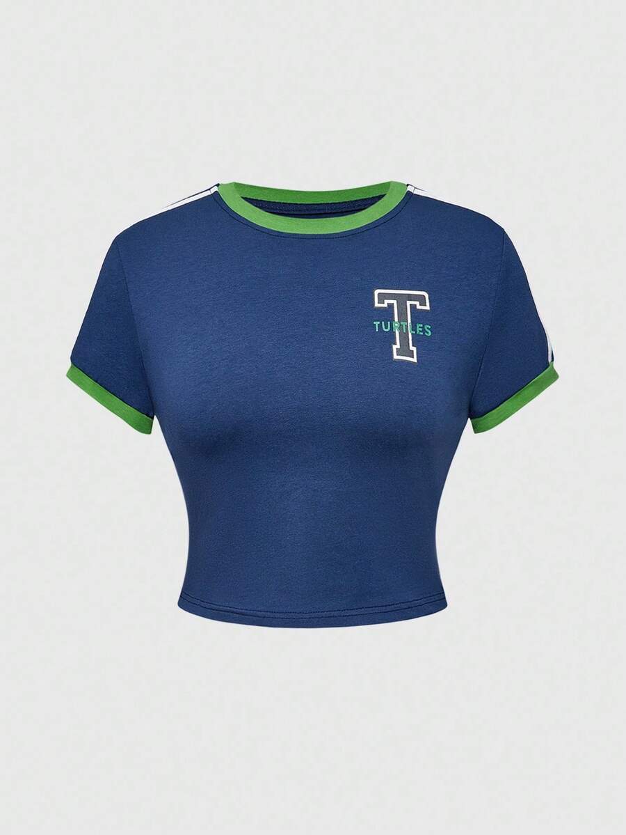 TEENAGE MUTANT NINJA TURTLES X ROMWE T-shirt corta aderente da donna con scollo rotondo, maniche corte e dettagli a contrasto con grafica a lettere