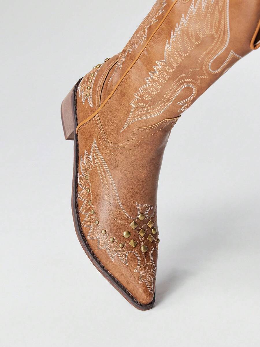 Fairycore Stivali western da donna in stile punk gotico scuro ricamati, stivali in pelle con borchie e tacco basso, color marrone, altezza polpaccio