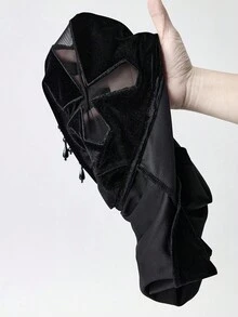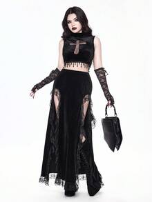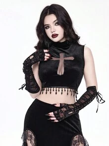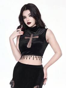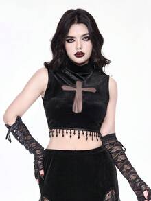 Goth Canotta in velluto a collo alto con pendente a croce traforato e cristalli, stile gotico, per donna