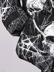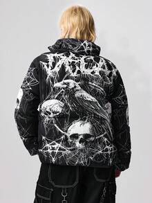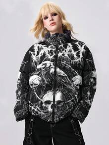Grunge Punk Cappotto imbottito da donna con stampa all-over di teschi gotici, pentagrammi e ragnatele