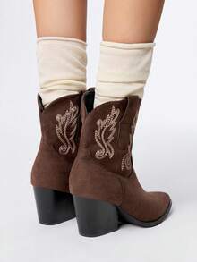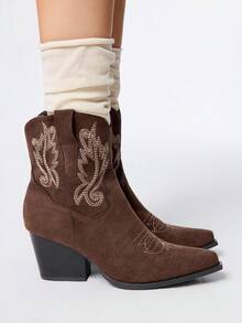 Fairycore Stivali da cowgirl con punta affusolata e tacco largo, con ricamo simmetrico, stivali da cowboy, nuovi stivaletti e stivali corti in pelle con elastico, stile autunno/inverno