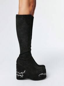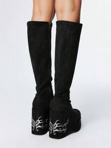 Goth Stivali da donna con punta tonda, suola platform spessa, in tessuto scamosciato nero con ricamo, cucitura bianca, moda e comfort per uso quotidiano, feste, discoteche, con cerniera laterale