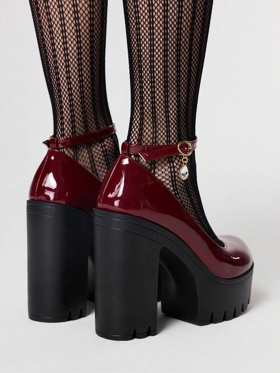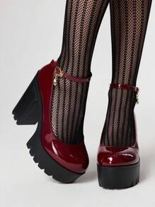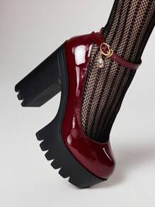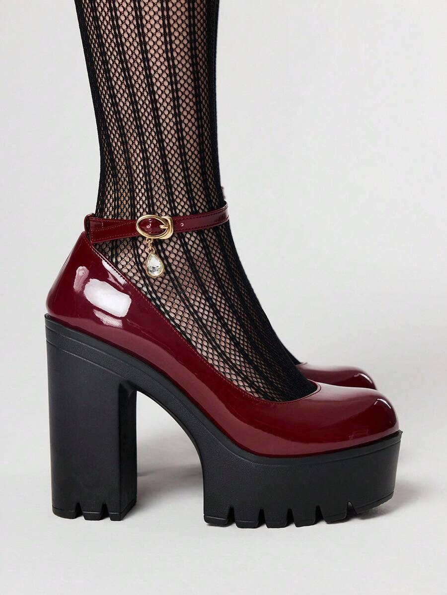 Goth Scarpe con tacco alto donna, con suola spessa e tacco chunky, di colore unito, con pendente metallico e fibbia alla Mary Jane, di moda, adatte per primavera e autunno